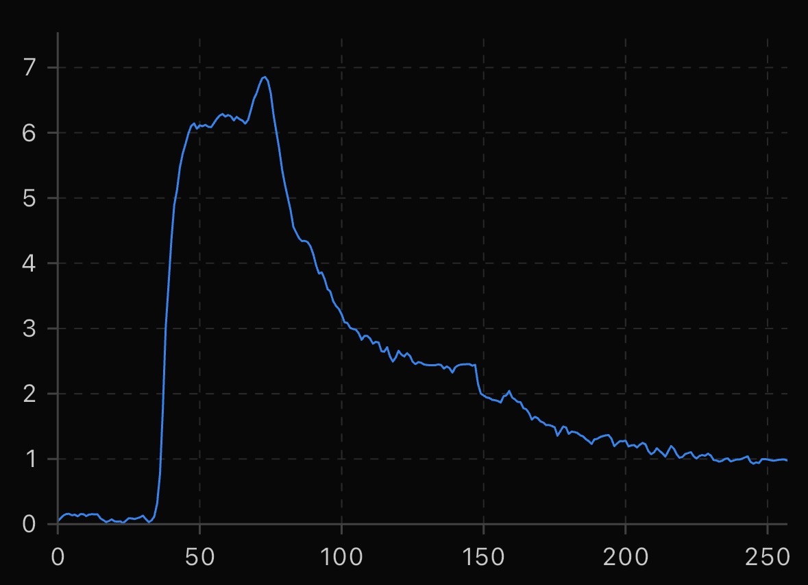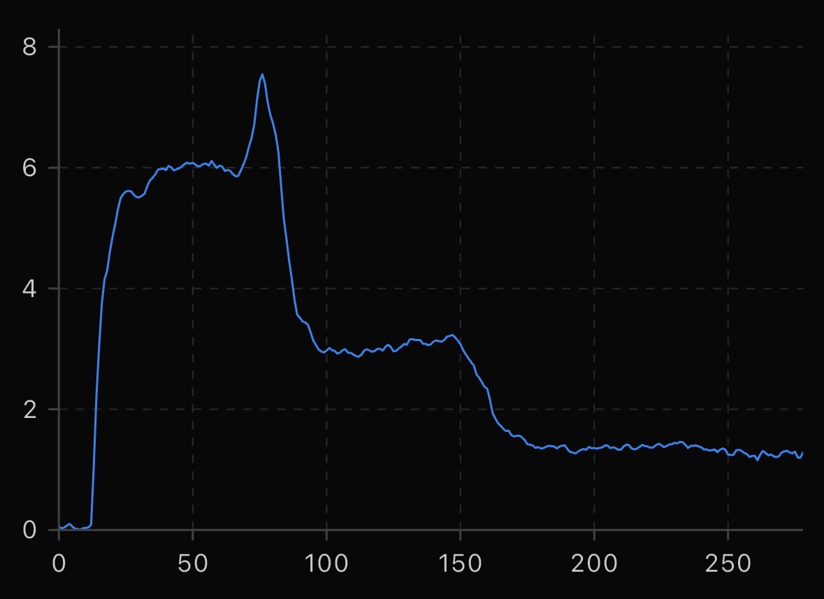 可以獲得實時數據的特性使 Portal 成了嘗試解答上述問題的最好工具之一,換句話說,我可以清楚地知道在沒有透過分水器注水時(也就是造成擾動時)究竟發生了什麼樣的事情,進行了幾次沖煮後,我發現了如下圖般的現象:在注水時的瞬時濃度會大幅下降,而停止注水後,濃度則略為上升或保持不變。使用分水器降低擾動時,濃度則隨著時間平穩地緩慢下降。